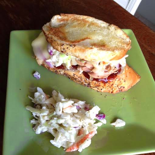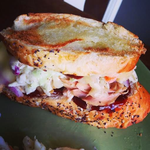 - Top with generous portion of coleslaw and top with slice of toasted bread.